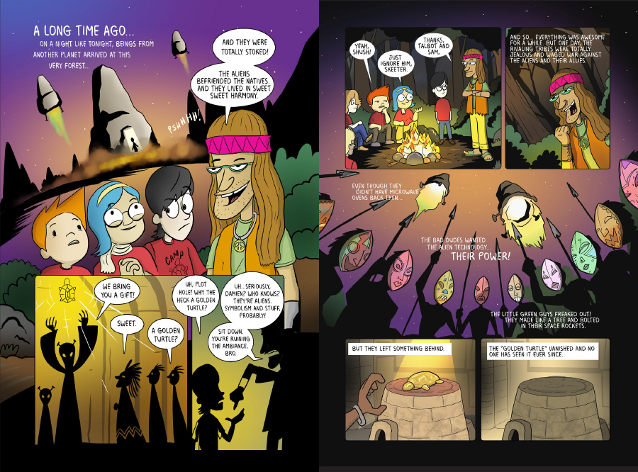 (2-in-1 Graphic Adventure! Includes Legend of The Golden Turtle and Sweet Stuff Overload). When Talbot and Damien join Samantha on a weekend trip to Camp Turtomunga, they never expected it to turn into an all out alien escapade. Join the gang as they uncover the secrets of the legendary Golden Turtle and the ancient turtle-like aliens that arrived many years ago. Can they help their Turtian friend return to his home planet? Or will the robotic alien army of the Guronites stop them?